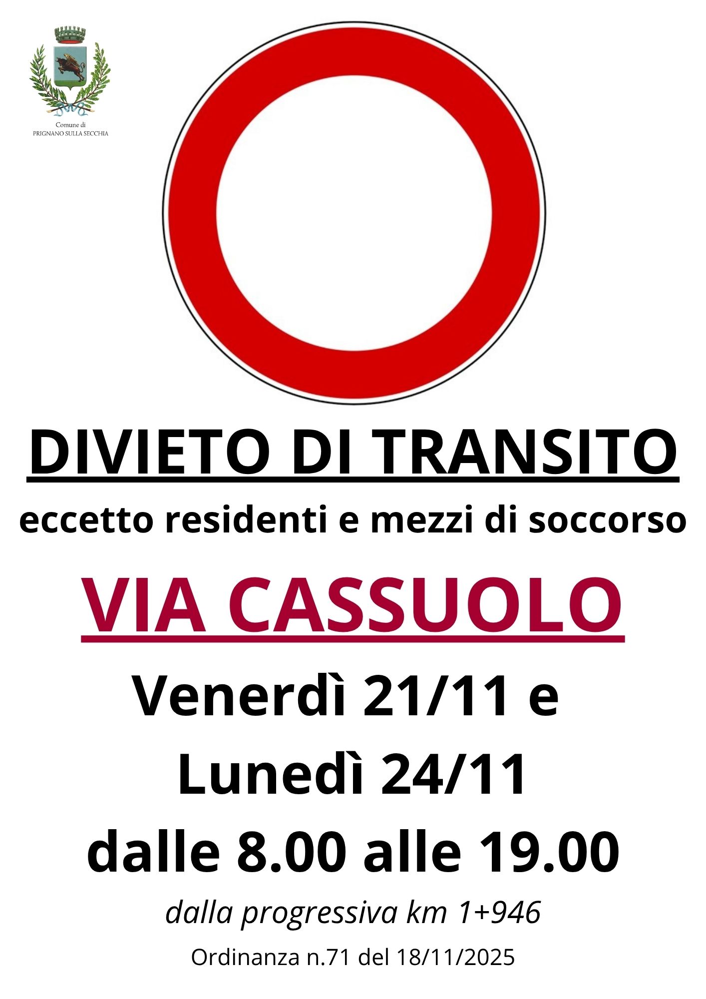 Il Comune di Prignano sulla Secchia informa la cittadinanza che nelle giornate di venerdì 21 novembre e lunedì 24 novembre la strada comunale Via Cassuolo sarà interdetta al transito a partire dal km 1+946, dalle ore 8:00 alle ore 19:00 (e comunque fino al completamento degli interventi).