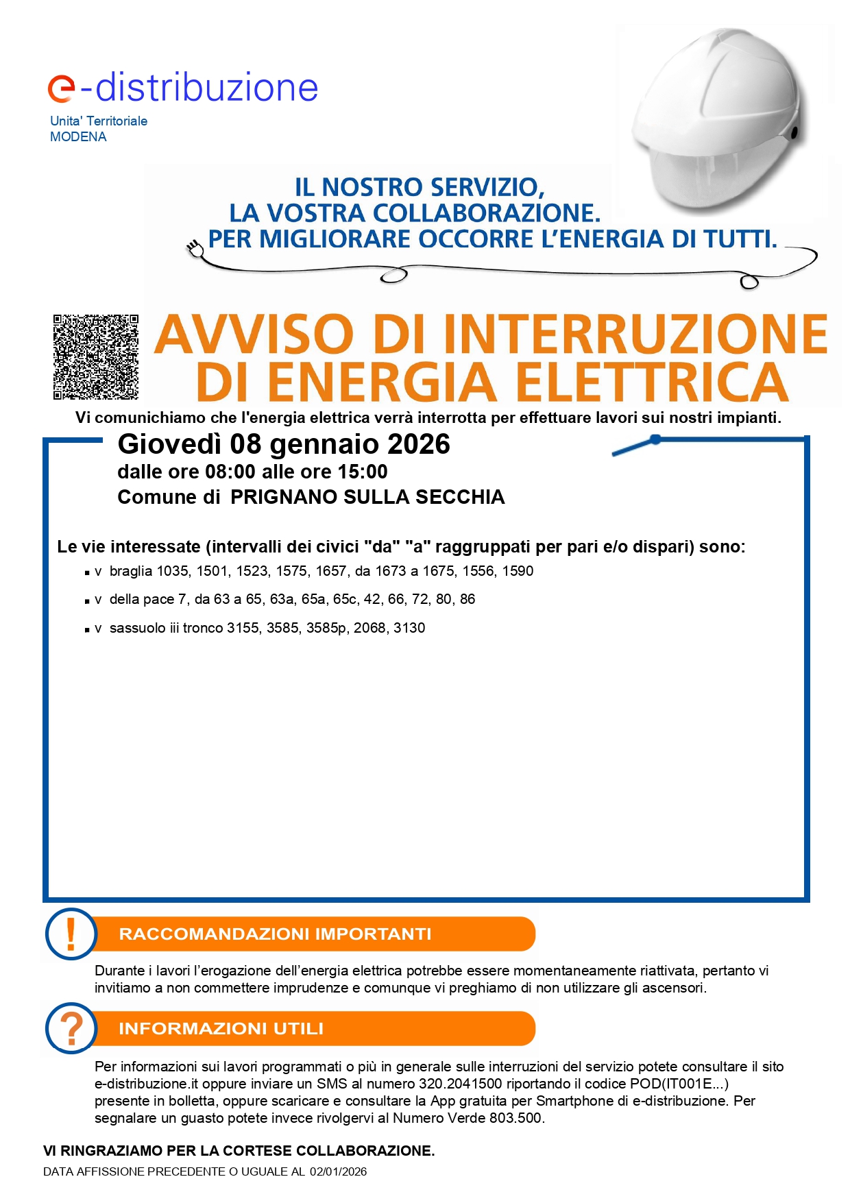 Si informa la cittadinanza che E-Distribuzione ha comunicato che, a causa di interventi legati all'installazione della fibra ottica, sarà necessaria l'interruzione di energia elettrica il giorno 08 gennaio dalle ore 8.00 alle ore 15:00 per permettere agli operatori di potere lavorare in sicurezza.