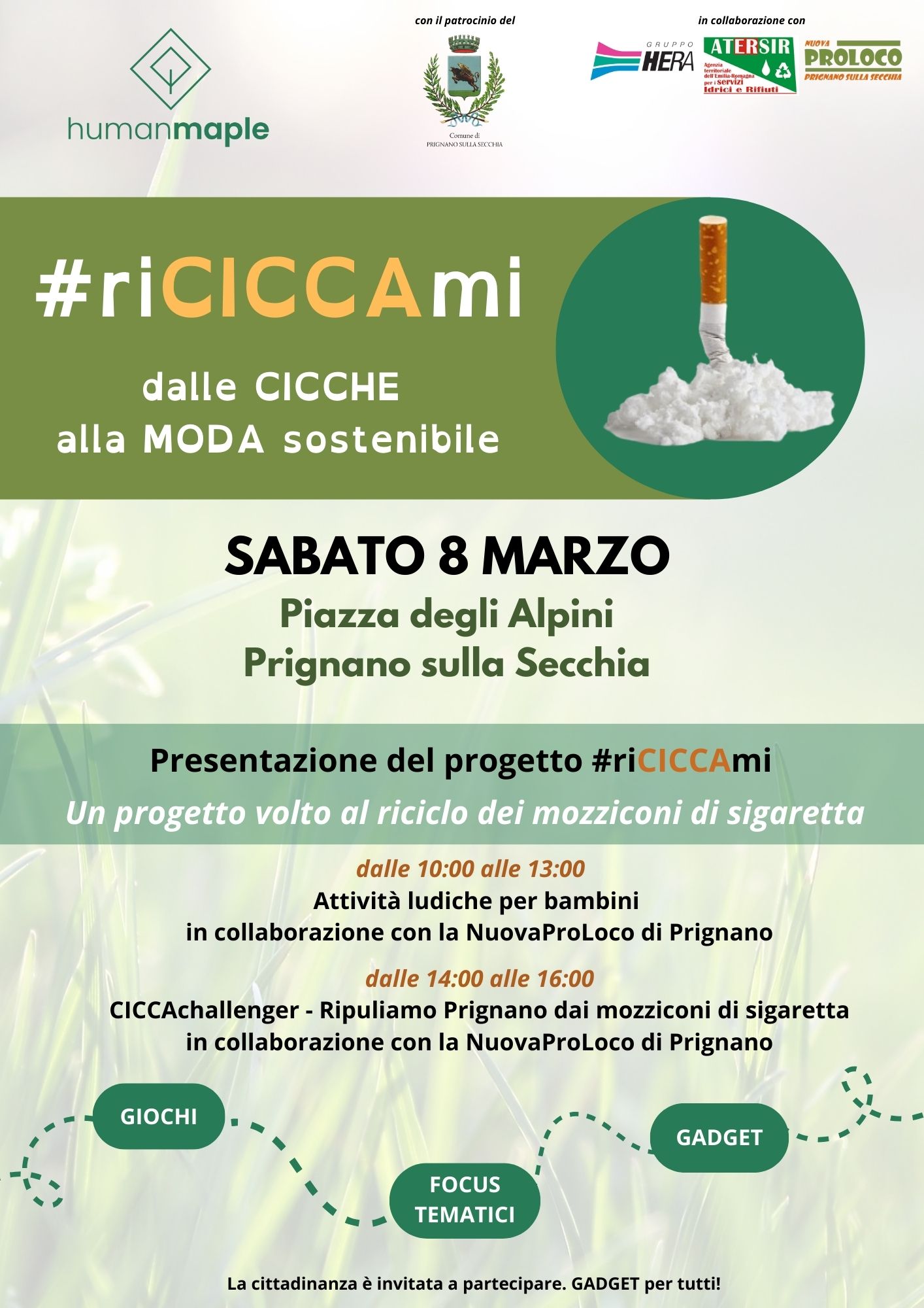 La start-up Human Maple, con il patrocinio del Comune di Prignano sulla Secchia in collaborazione con Hera spa, ATERSIR e NuovaProLoco di Prignano, presentano a tutta la cittadinanza il progetto #riCICCAmi (un progetto volto al riciclo dei mozziconi di sigaretta - Maggiori informazioni sul progetto).